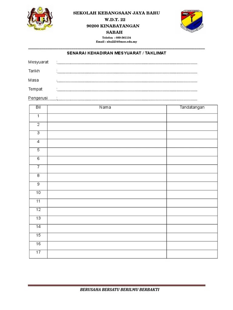 Contoh Senarai Kehadiran Mesyuarat - Bahan rujukan utama (jika ada).
