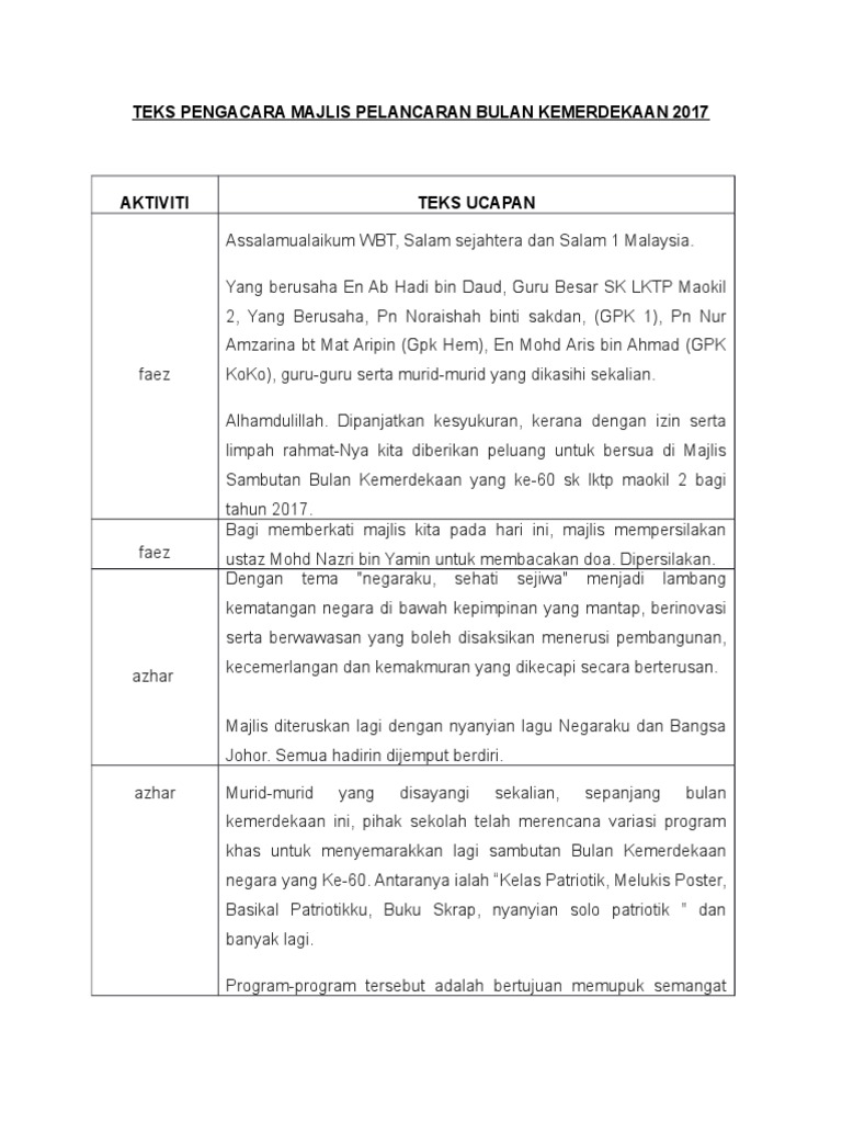 Teks pengacara majlis pelancaran bulan kemerdekaan. Check spelling or type a new query. We did not find results for: Maybe you would like to learn more about one of these?